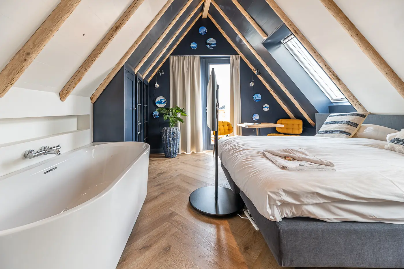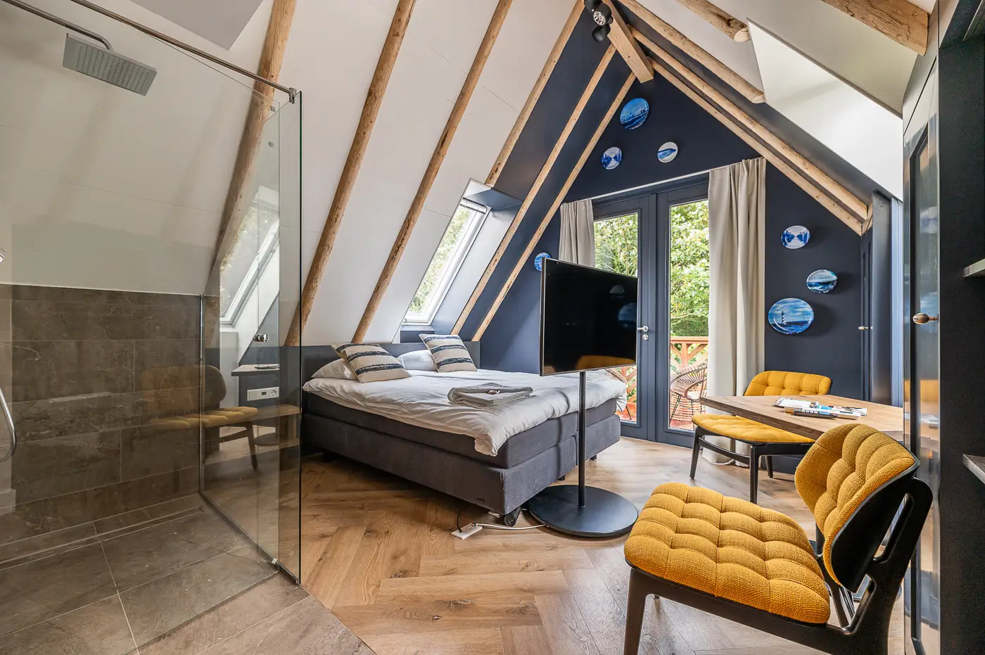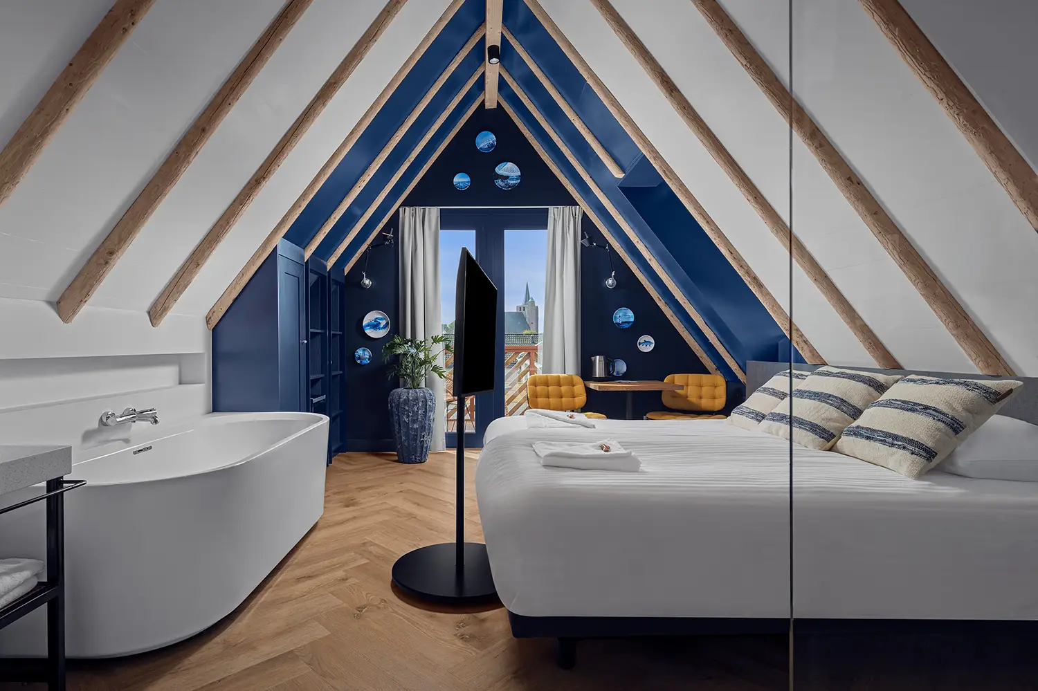 Zoals elke Junior Suite zijn de Cozy Suites voorzien zijn van alle denkbare luxe en comfort. Maar met de karakteristieke dakspanten, de mogelijkheid van een riant ligbad in de grootste Cozy Suite en het balkon op de 2e verdieping verblijf je letterlijk en figuurlijk op hoog niveau.